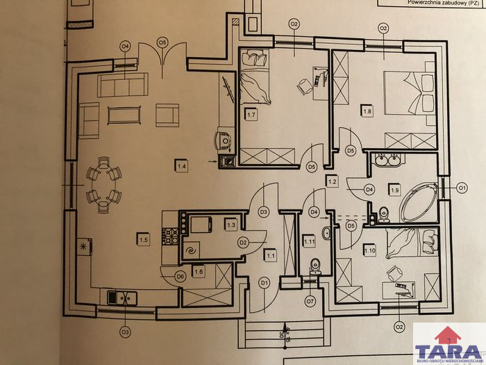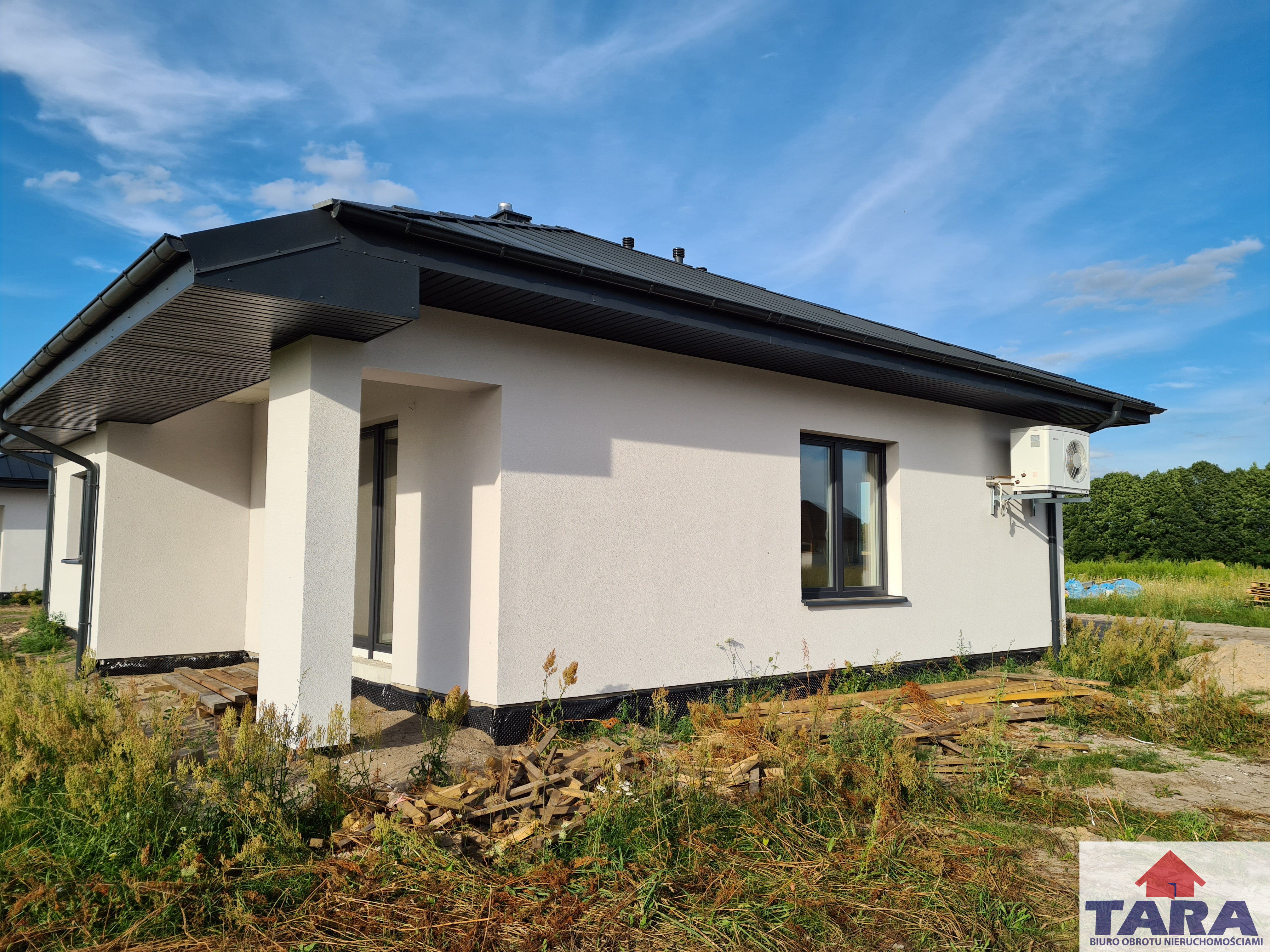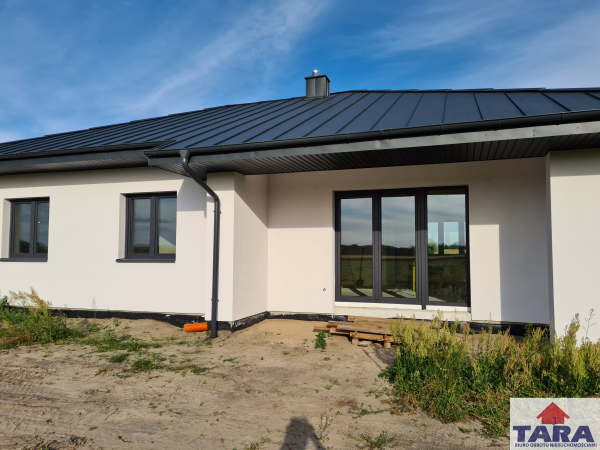 Biuro pośrednictwa w obrocie nieruchomościami Tara ze Żnina przedstawia Państwu ofertę sprzedaży domu jednorodzinnego położonego na działce o powierzchni 739m2. Budynek parterowy o powierzchni użytkowej 104,5m2 i powierzchni zabudowy 135m2, wolnostojący, niepodpiwniczony kryty dachem czterospadowym o kącie nachylenia połaci dachowych 25*. Pokrycie dachowe wykonane z blachy stalowej płaskiej na t.zw. rąbek stojący w kolorze grafitowym. Materiał ten jest w zgodzie z aktualnymi trendami, charakteryzuje się lekkością, trwałością i prostą formą dominującą obecnie w nowoczesnej architekturze. Dom zbudowany w technologii tradycyjnej udoskonalonej. Ściany nośne wykonane z bloczków gazobetonowych gr. 24cm. Ściany zewnętrzne ocieplone styropianem grafitowym (o podwyższonej izolacji termicznej), grubości 20 cm, współczynniku przenikania ciepła 0/033W (m.K). Aby ciepło nie umykało przez strop zastosowane ocieplenie 40 cm wełną lambda 39*. Na całej powierzchni domu założone zostało ogrzewanie podłogowe przy zastosowaniu 20 cm izolacji termicznej o współczynniku przenikania ciepła 038. Okna trzyszybowe + Energy. W salonie zastosowane okno trzyskrzydłowe, podwójnie otwierane plus skrzydło witrynowe, z którego wychodzi się na taras. Jest również miejsce na kominek. W budynku zainstalowany został nowoczesny, ekologiczny i bezpieczny system grzewczy czyli pompa ciepła. Założona także instalacja alarmowa. Dom wyposażony w rynny i parapety zewnętrzne stalowe grubości 0,7mm, które są trwałe i odporne na zniszczenia oraz działanie czynników chemicznych.