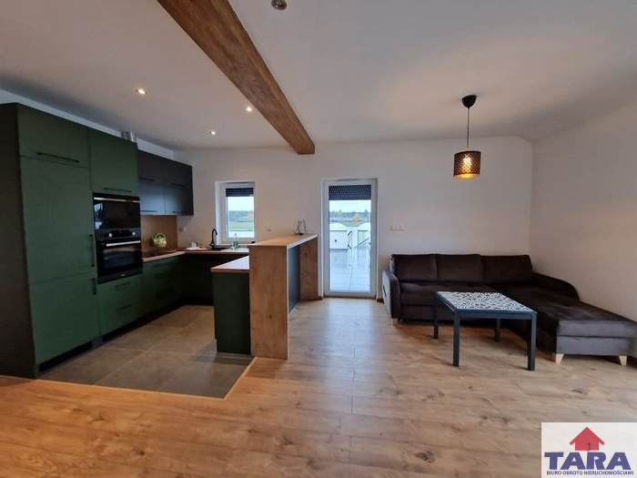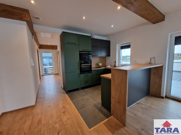Biuro pośrednictwa Tara w Żninie przedstawia Państwu ofertę najmu lokalu mieszkalnego zlokalizowanego na nowym osiedlu mieszkalnym w Łabiszynie. Budynek składa się z czterech samodzielnych lokali. Do każdego lokalu jest własne wejście. Do wynajęcia przeznaczone jest mieszkanie na piętrze. Wejście do niego jest z poziomu zerowego do klatki schodowej prowadzącej na piętro. Tutaj zastaniecie Państwo mieszkanie rozkładowe, wykończone z pięknym dużym tarasem z którego jest zejście do ogródka rekreacyjnego, ogrzewane własnym kotłem gazowym firmy Buderus. W lokalu zainstalowano ogrzewanie podłogowe z wyjątkiem pokoi- sypialni. Mieszkanie dobrze doświetlone, okna nowoczesne sięgające do podłogi. Aneks kuchenny w estetycznej, nowej zabudowie z wbudowaną lodówką, zamrażarką i zmywarką. Na podłogach panele i płytki. Z korytarza wejście na poddasze wyłożone w całości płytami OSB.