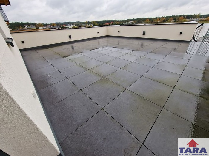 Do lokalu przynależy taras 45m2 i garaż 21 m2. Ponadto najemca ma możliwość użytkowania przydomowego ogródka rekreacyjnego. Powierzchnia między budynkami wyłożona kostką brukową. Teren ogrodzony. Dojazd drogą nieutwardzoną.
